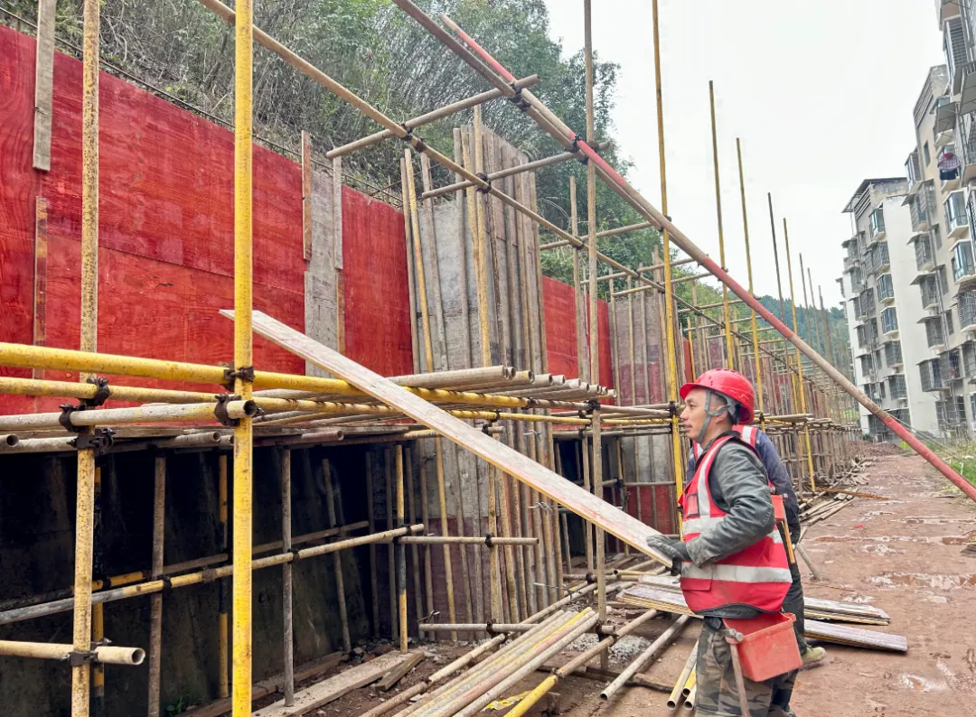 在安居区凤凰街道龚家湾安置小区后方崩塌治理工程现场,工人们正有条不紊地开展木板加固作业,为后续施工工序做好铺垫。龚家湾安置小区后方的崩塌区属于剥蚀低山丘陵地貌,因长年降雨影响,土坡土质疏松,去年9月,该区域发生长330米、高40米的崩塌,小区120户258人的生命财产安全受到威胁。为此,安居区迅速行动,积极争取地质灾害治理项目资金,及时完善应急预案,构建起群测群防监测预警体系,并向受威胁群众发放避险明白卡,于同年12月正式启动崩塌治理工程建设。“木板加固完后会进行混凝土浇筑,待混凝土凝固,便安装被动防护网。”安居区凤凰街道龚家湾安置小区后方崩塌治理工程负责人古茂说,目前整个工程已完成70%左右,预计今年4月底全部完工。