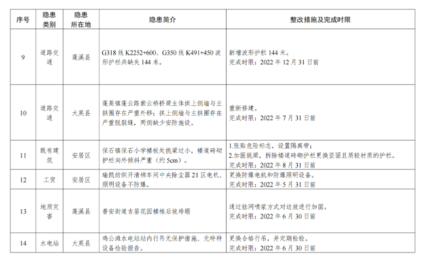 为持续深化安全生产隐患排查治理,切实消除安全隐患,有效防范和坚决遏制较大及以上生产安全事故,近日,遂宁市安委会发布《关于2022年度第一批市级挂牌督办重大安全隐患的通知》,对14个重大安全隐患进行挂牌督办。
