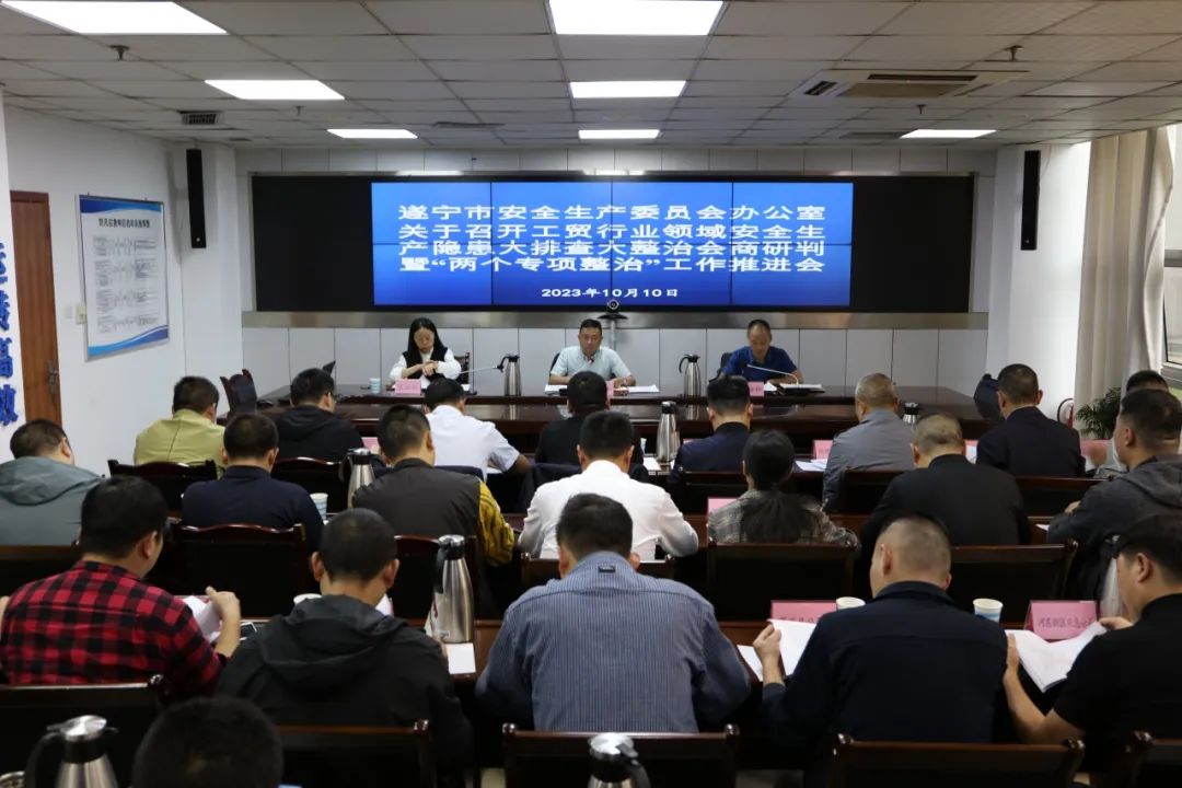 10月10日,遂宁市安全生产委员会办公室组织召开遂宁市工贸行业领域安全生产隐患大排查大整治会商研判暨“两个专项整治”工作推进会,分析研判工贸行业领域安全风险形势,研究部署下阶段专项整治重点工作。会议通报了近期工贸行业领域“两个专项整治”督查检查工作情况,讲解培训了《遂宁市工贸行业领域安全生产隐患大排查大整治工作方案》,射洪市、遂宁经开区安办,市市场监管局还就工贸行业高风险领域安全生产专项整治、重大事故隐患专项排查整治2023行动工作开展及下阶段工作计划作交流发言。