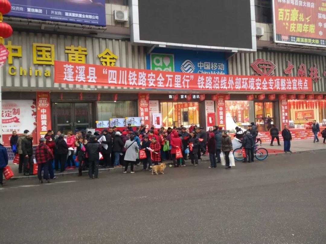 春节将至,为营造“人人参与爱路护路、全员维护铁路安全”的浓厚氛围,不断将“四川铁路安全万里行”铁路沿线外部环境安全专项整治活动引向深入,创造安全稳定的出行环境,2019年1月25日,蓬溪县安办牵头,组织县安监局、县发改局、县综治办、赤城镇、鸣凤镇、大石镇、宝梵镇、下东乡、上游工业园区等单位在红星桥开展“四川铁路安全万里行”铁路沿线外部环境安全专项整治集中宣传活动。
