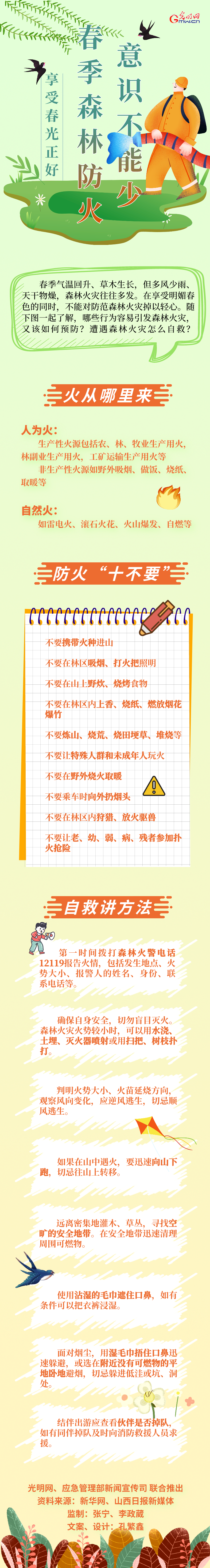 春季气温回升、草木生长,但多风少雨、天干物燥,导致森林火灾多发。在享受明媚春色的同时不能对防范森林火灾掉以轻心。哪些行为容易引发森林火灾?森林火灾该如何预防?遭遇森林火灾怎么自救?看图了解。