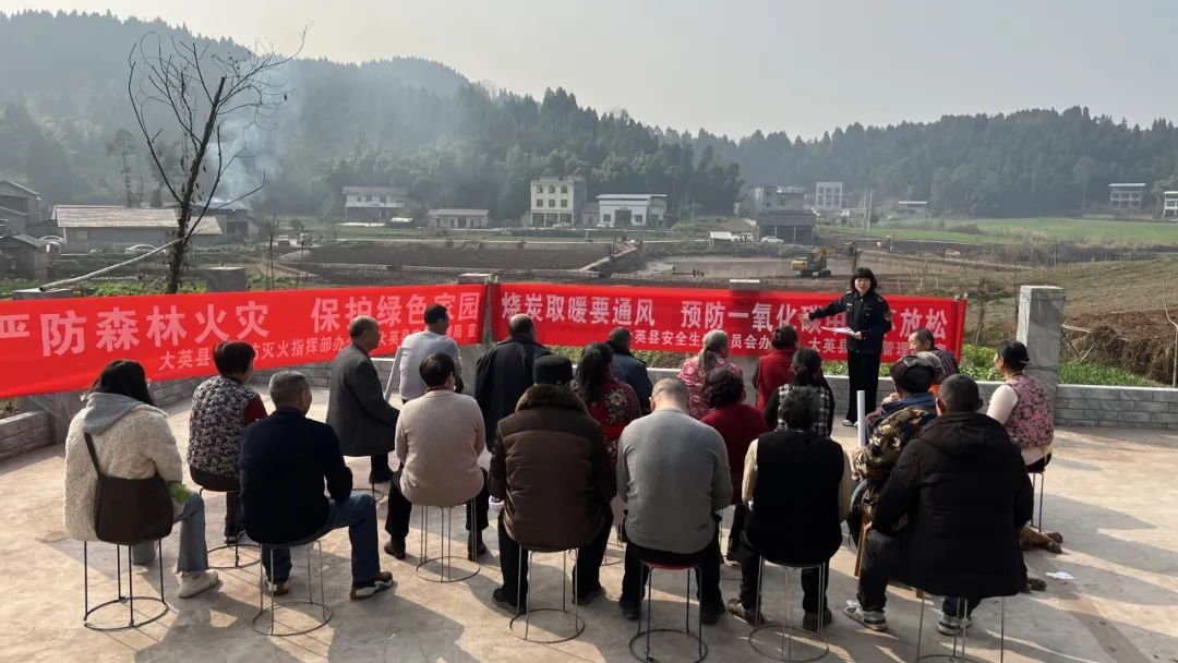 近日,在大英县玉峰镇水阁村,村民围坐在村民张时江家的院子里,工作人员正在宣传冬季预防一氧化碳中毒和森林防灭火安全知识。