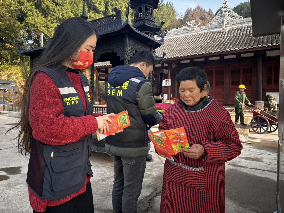 “婆婆,给您老人家介绍哈森林火灾的危害以及森林防灭火相关的法律法规。”在蓬溪县常乐寺,县应急局和县民族宗教局的工作人员正在开展森林防火宣传到寺庙活动。常乐寺背靠国有林区,是森林防火重点区域,遇节假日、宗教活动老人、小孩聚集,森林火险形势十分严峻。为将寺庙、道观等重点区域的森林防火宣传做微做细,打通宣传教育的“最后一公里”,蓬溪县积极组织部门、属地针对僧、尼、信众等重点人群常态化开展森林防火宣传,邀请和鼓励他们参与到防火行动中来,由防控对象转变管理人员,共筑共建绿水青山防火屏障。