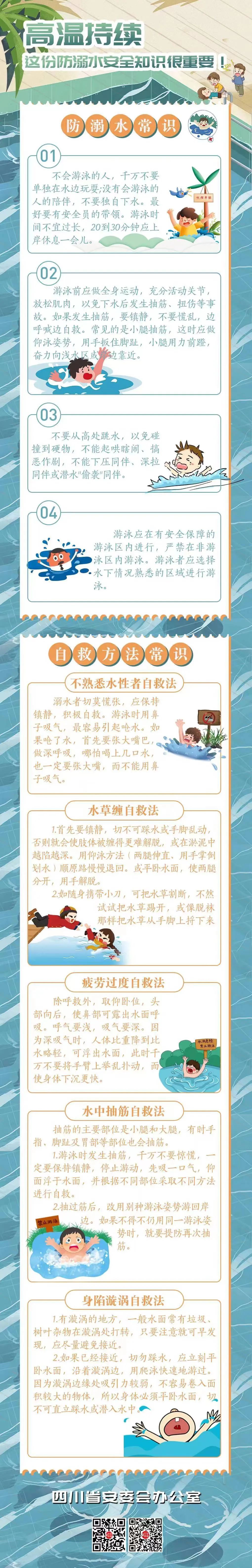 近期,高温天气持续,水上运动成为消暑纳凉的好选择,但是也同样存在很大的安全风险。数据显示,我国每年约有5.7万人死于溺水,其中少年儿童就占56.04%。在此,四川省安委会办公室提醒您:熟练掌握关于防溺水的安全知识,提高安全意识和自救自护能力。