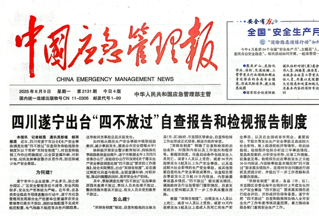 中国应急管理报头版头条:《四川遂宁出台“四不放过”自查报告和检视报告制度》