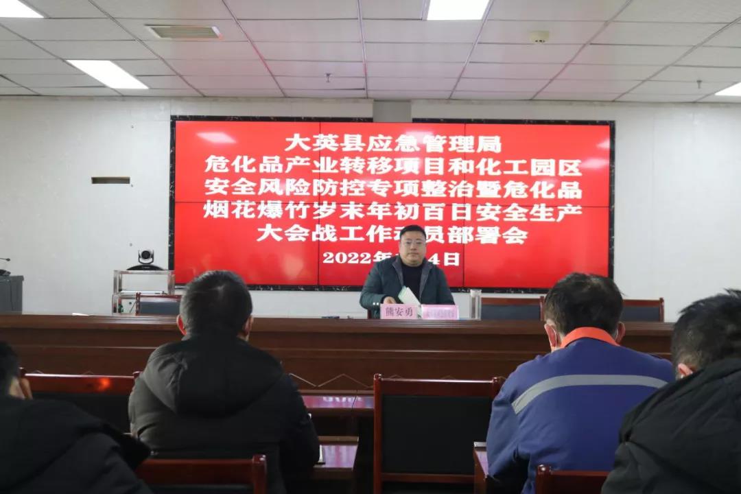 1月4日,大英县应急管理局组织召开县危险化学品和烟花爆竹领域岁末年初百日安全生产大会战工作部署会,全县11家危险化学品企业和3家烟花爆竹批发企业主要负责人参会。