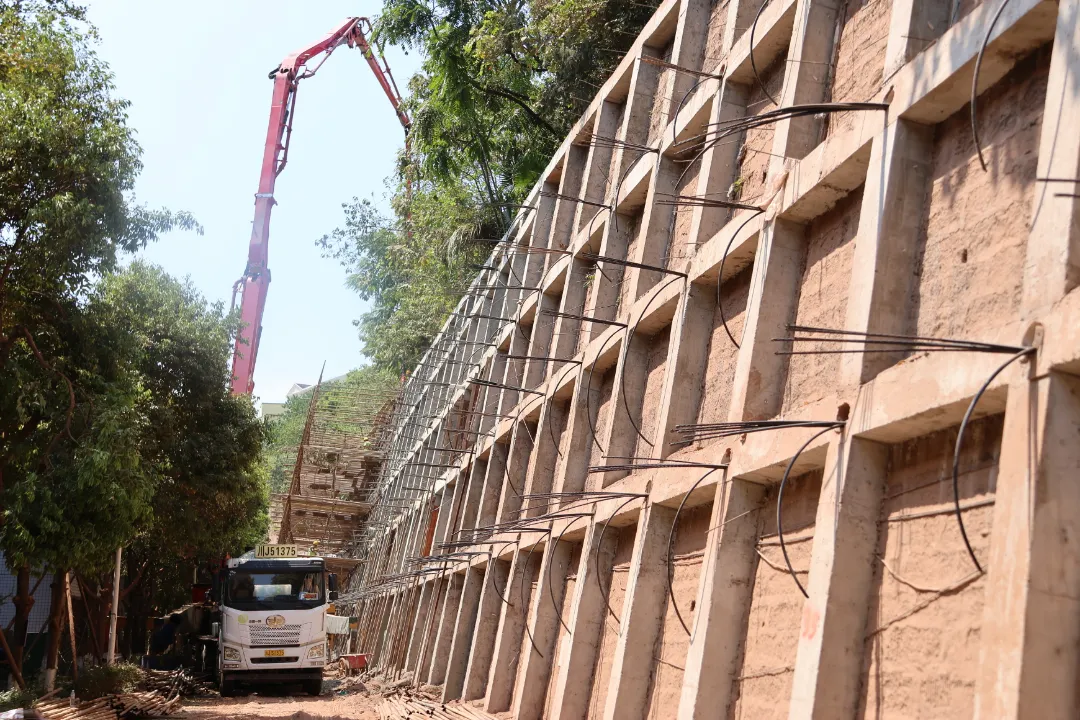 四川资源集团项目副经理黄青松告诉记者,项目将260米细分为教学楼段(120米)、操场段(140米),当前已完成全段260米的打孔和锚固作业,教学楼主体已完工,仅剩余操场段格构梁混凝土浇筑等工作,建设总体进度约90%,本月20日项目主体工程将全部完工。