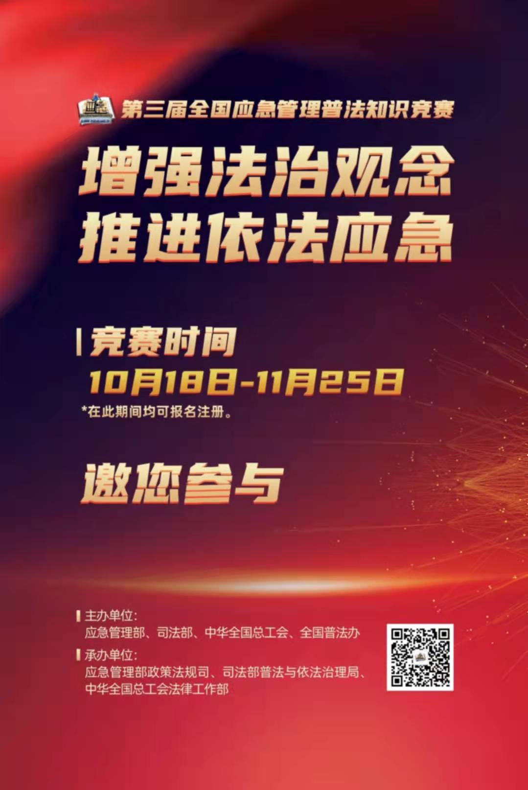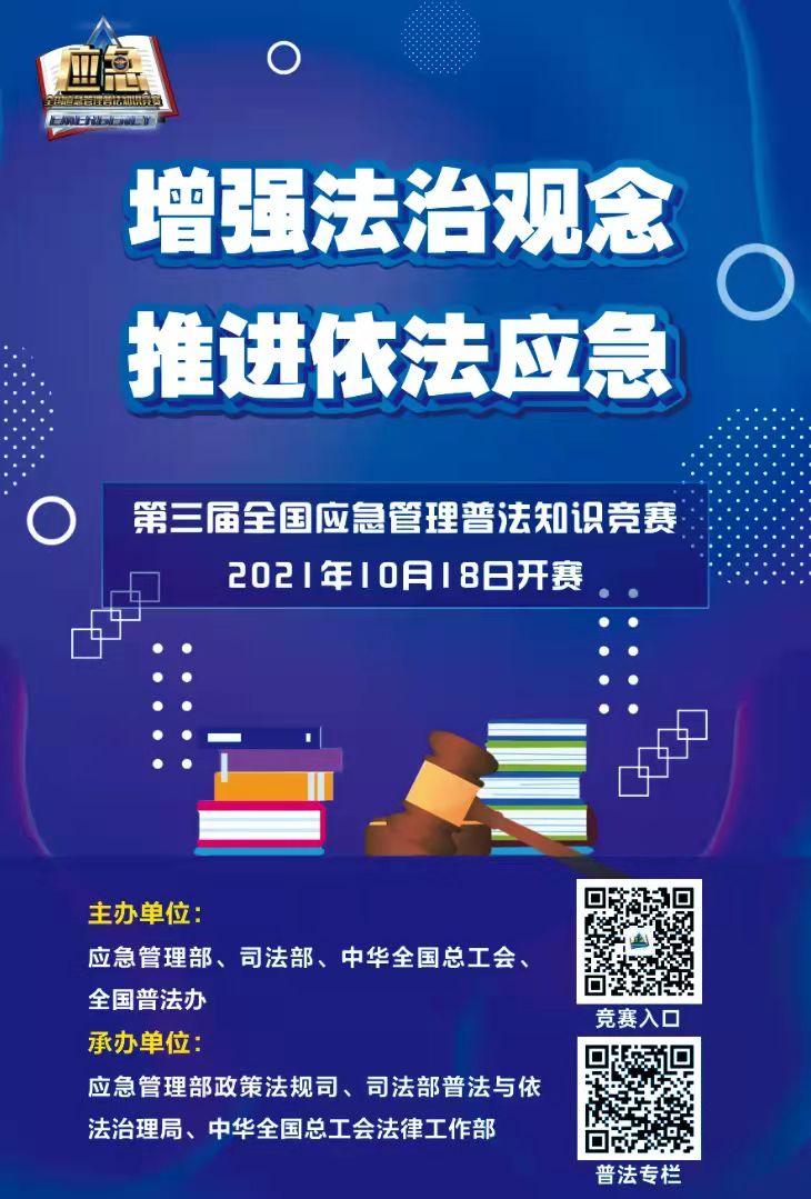 应急管理部、司法部、中华全国总工会、全国普法办共同举办的第三届全国应急管理普法知识竞赛将于10月18日开赛。本届竞赛主题是“增强法治观念,推进依法应急”,竞赛分集训营、实战营、总决赛,采用线上答题模式,通过扫描竞赛答题平台二维码进行学习答题。2021年是“十四五”开局之年,也是“八五”普法启动之年,为深入学习宣传习近平法治思想和习近平总书记关于应急管理重要论述精神,进一步加大全民普法力度,增强干部职工群众安全法治意识,展现应急管理法治建设成就,应急管理部、司法部、中华全国总工会、全国普法办决定共同举办第三届全国应急管理普法知识竞赛活动。