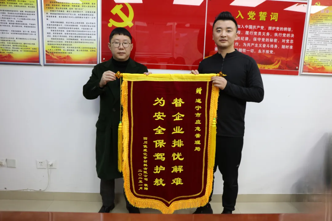 1月14日,四川佳威化学材料有限公司向遂宁市应急管理局送上一面印有“替企业排忧解难 为安全保驾护航”的锦旗,以此感谢遂宁市应急管理局在优化营商环境、安全指导服务等方面给予的帮助和支持。