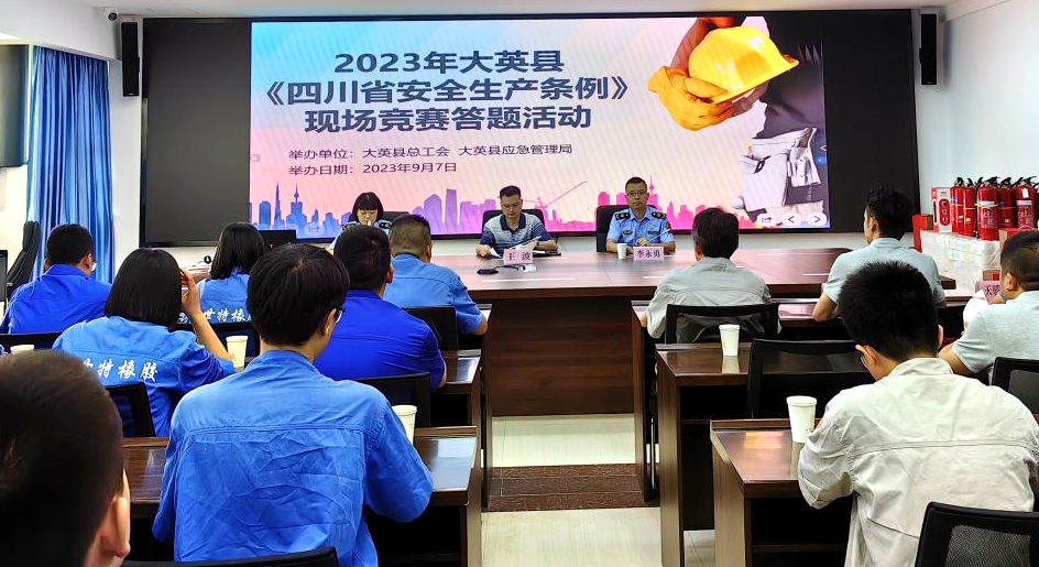 9月7日,新修订《四川省安全生产条例》实施一周,遂宁市大英县应急管理局、县总工会联合举办《四川省安全生产条例》现场竞赛答题活动,大英县恒达建材有限公司、四川飞亚动力科技股份有限公司等8支重点工贸企业代表队比脑力拼实力,以赛促学,以学促干,检验出企业员工对《条例》的掌握程度,进一步强化企业职工安全法治意识,牢固树立安全发展理念。