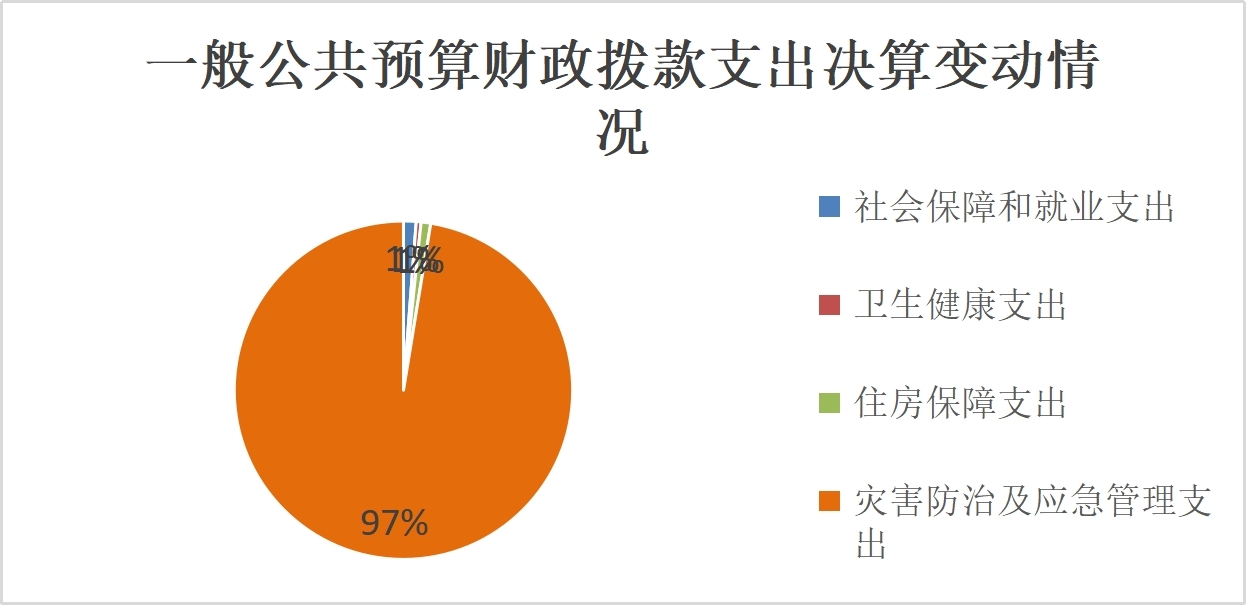 2024年一般公共预算财政拨款支出10543.67万元,主要用于以下方面:社会保障和就业支出126.60万元,占1.20%;卫生健康支出48.85万元,占0.46%;住房保障支出96.95万元,占0.92%;灾害防治及应急管理支出10271.28万元,占97.42%。