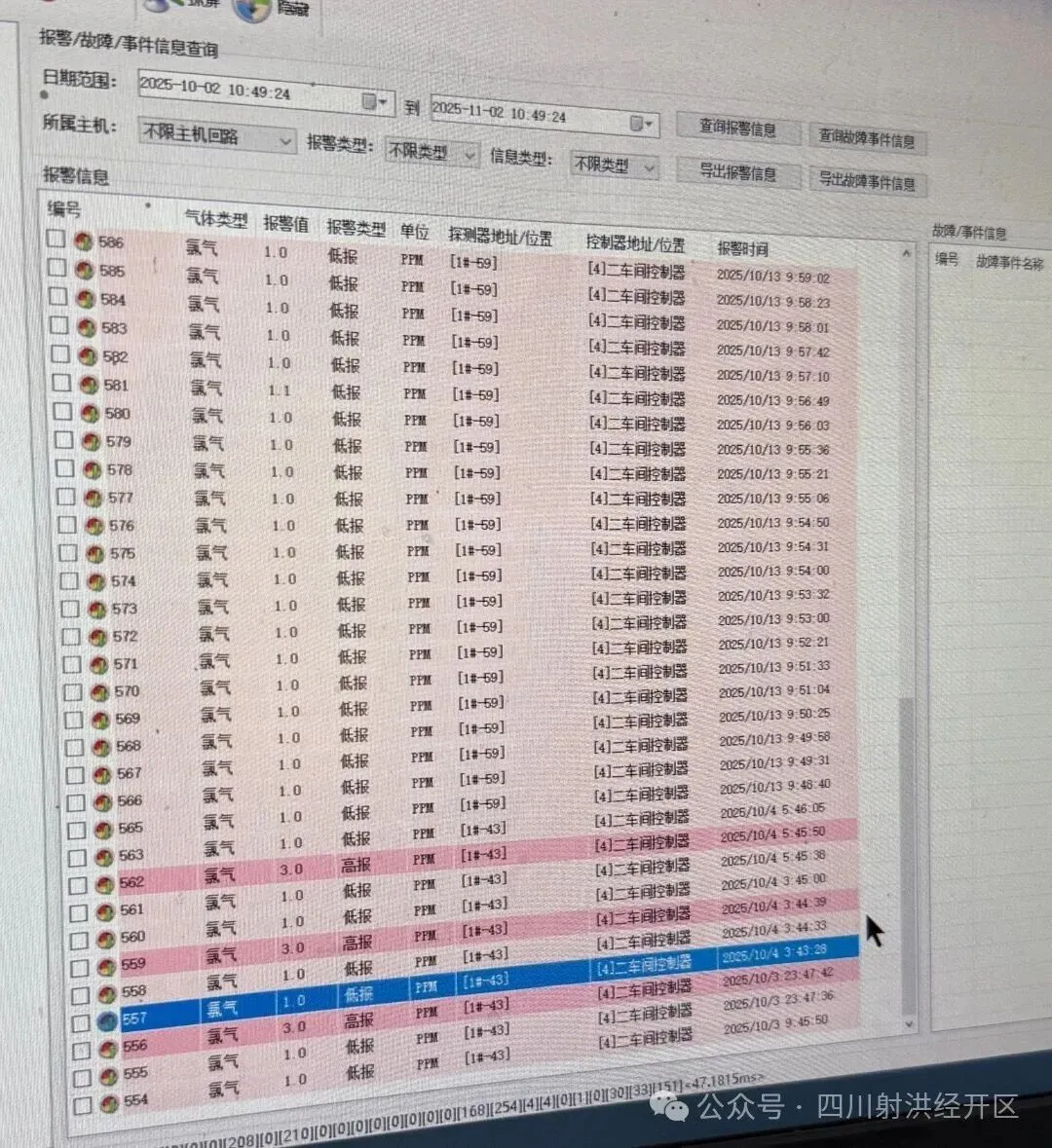 10月4日氯气超标报警长达约2小时,无报警处置记录及原因分析。