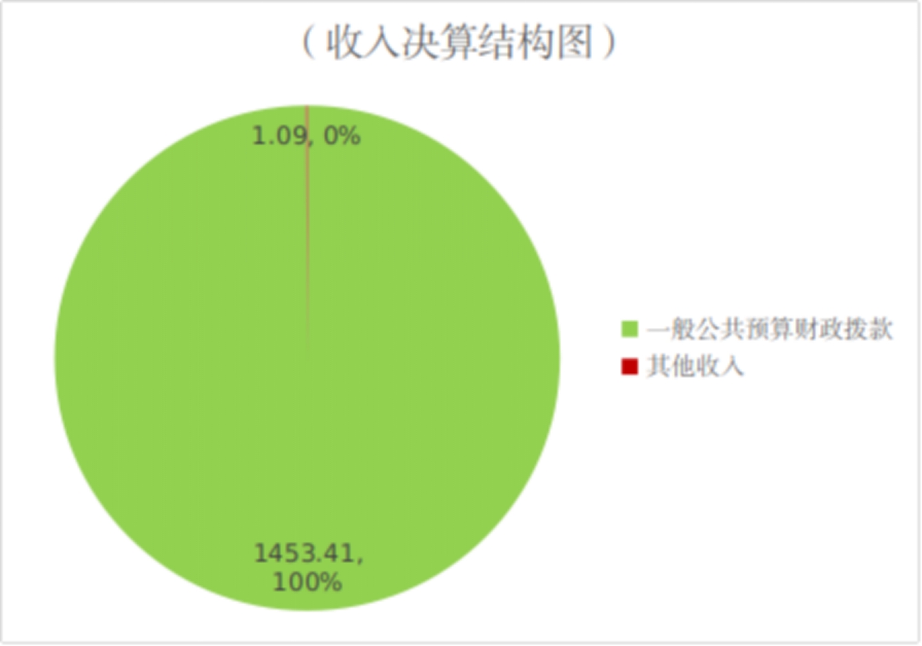 2020年本年收入合计1454.49万元,其中:一般公共预算财政拨款收入1453.41万元,占99.93%;政府性基金预算财政拨款收入0万元,占0.00%;上级补助收入0万元,占0.00%;事业收入0万元,占0.00%;经营收入0万元,占0.00%;附属单位上缴收入0万元,占0.00%;其他收入1.09万元,占0.07%。