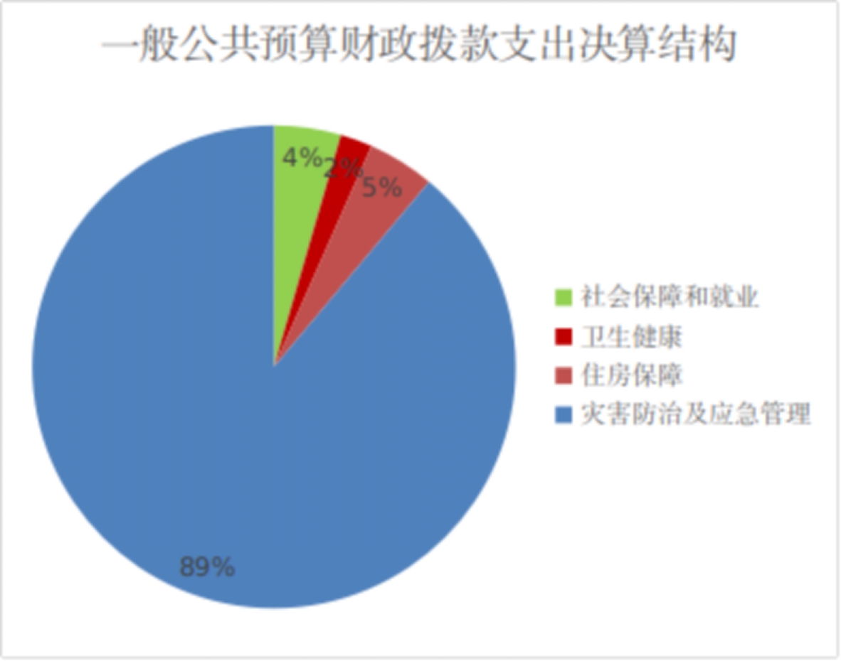 2020年一般公共预算财政拨款支出1322.88万元,主要用于以下方面:一般公共服务(类)支出0万元,占0.00%;教育支出(类)0万元,占0.00%;科学技术(类)支出0万元,占0.00%;文化旅游体育与传媒(类)支出0万元,占0.00%;社会保障和就业(类)支出59.21万元,占4.48%;卫生健康支出28.30万元,占2.14%;住房保障支出59.29万元,占4.48%;灾害防治及应急管理支出1176.08万元,占88.90%。(罗列全部功能分类科目,至类级。)