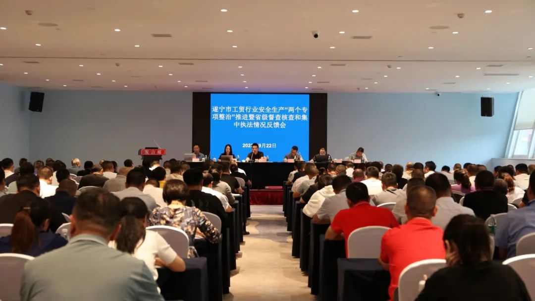 9月22日上午,四川省应急管理厅在遂宁市组织召开工贸行业安全生产“两个专项整治”推进暨省级督查核查和集中执法意见反馈会。省级工贸行业督查核查和集中执法组第一组全体成员,遂宁市应急管理局、市经济和信息化局、市市场监管局、市商务局、市消防救援支队分管领导、相关业务科室负责人;各县(市、区)、市直园区工贸行业相关安全监管部门分管负责人、相关业务股室负责人以及部分工贸企业的负责人等参加会议。