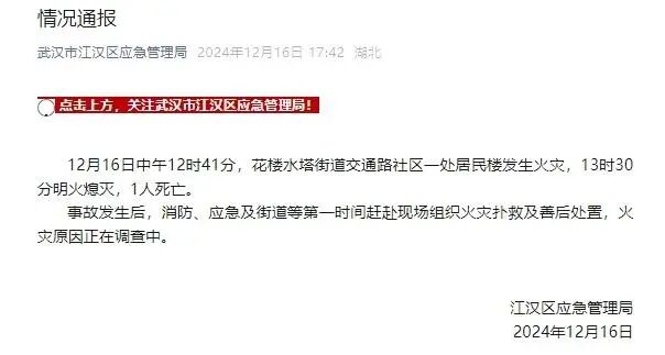 湖北武汉市江汉区应急管理局发布情况通报称,12月16日中午12时41分,花楼水塔街道交通路社区一处居民楼发生火灾,13时30分明火熄灭,1人死亡。事故发生后,消防、应急及街道等第一时间赶赴现场组织火灾扑救及善后处置,火灾原因正在调查中。