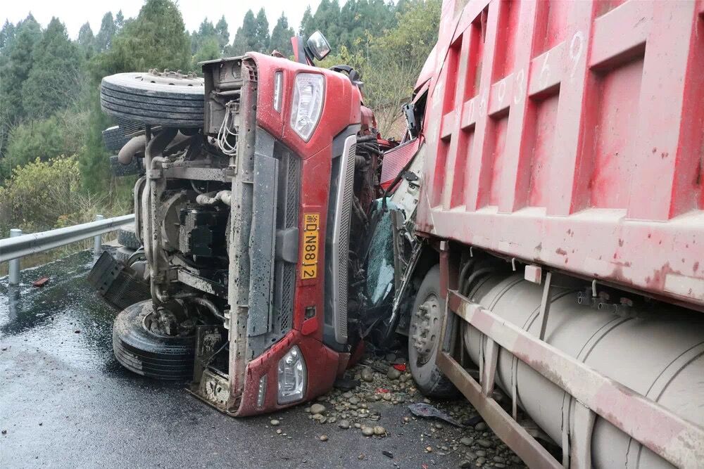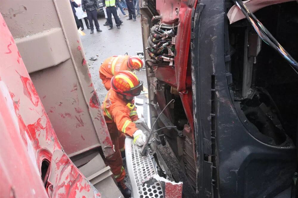 消防救援人员到达现场发现:一辆货车因撞击侧翻,驾驶室变形司机被困车内。