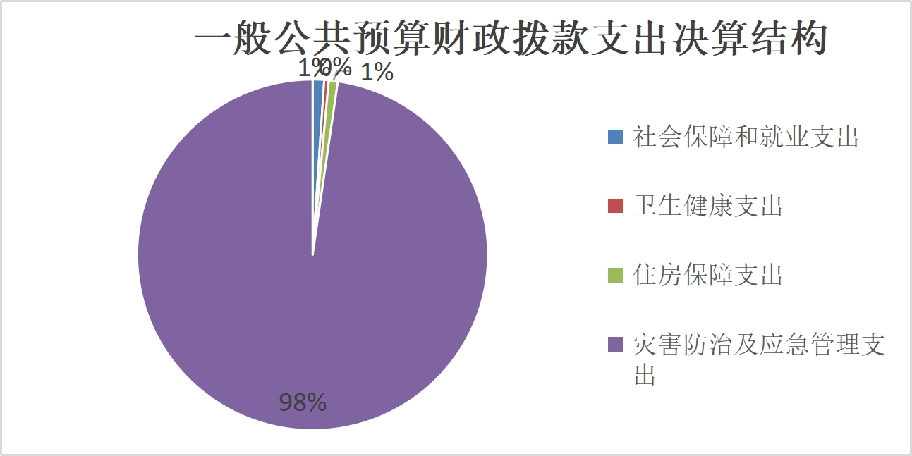 2024年一般公共预算财政拨款支出10359.69万元,主要用于以下方面:社会保障和就业支出109.27万元,占1.05%;卫生健康支出43.12万元,占0.42%;住房保障支出86.02万元,占0.83%;灾害防治及应急管理支出10121.29万元,占97.70%。