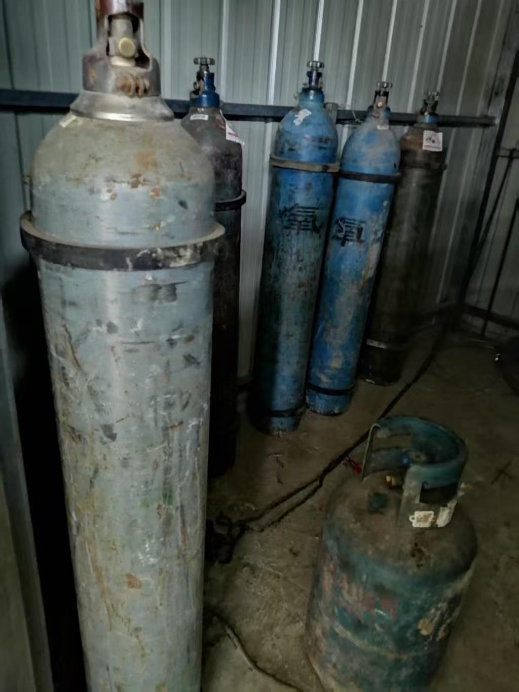 库房氧气瓶无防倾倒措施且与液化气瓶混放。