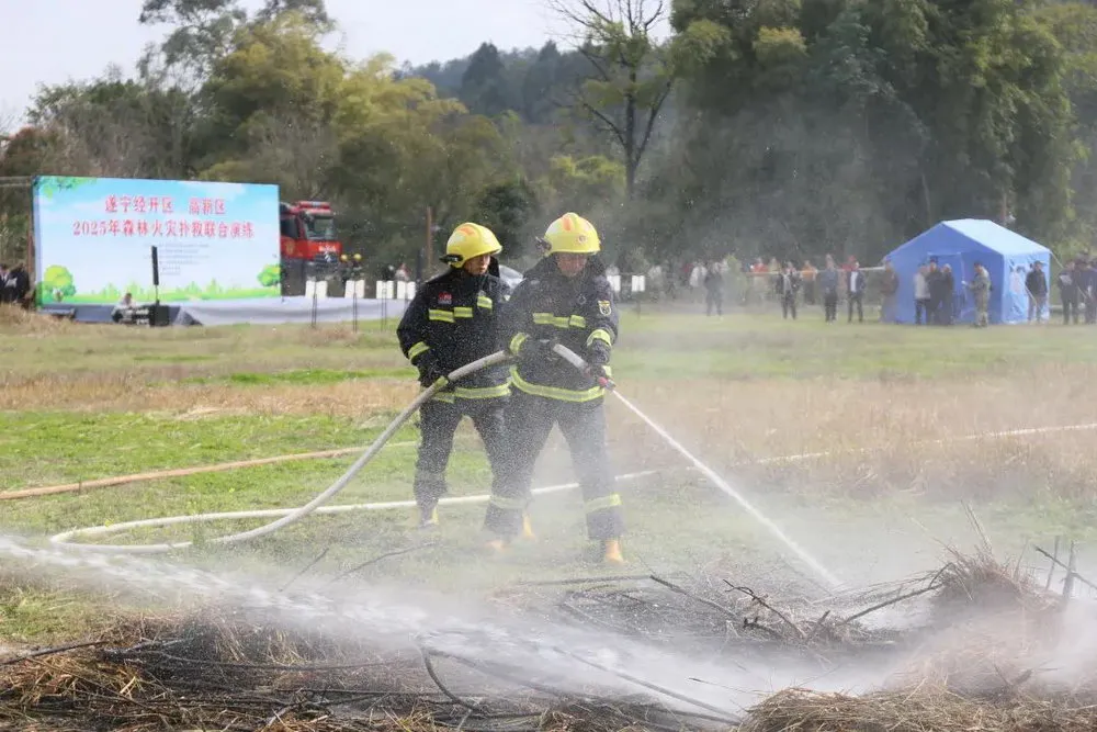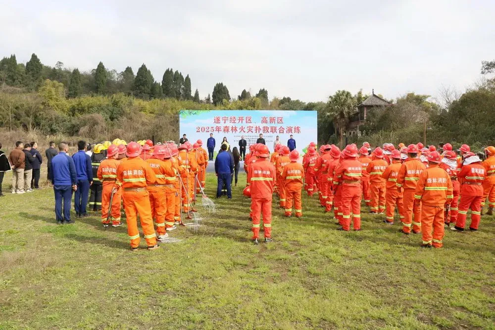 近日,遂宁经开区、高新区组织开展2025年森林火灾扑救联合应急演练,进一步检验预案、锤炼队伍、完善体制机制,有效提升森林扑火队伍的专业性和战斗力。