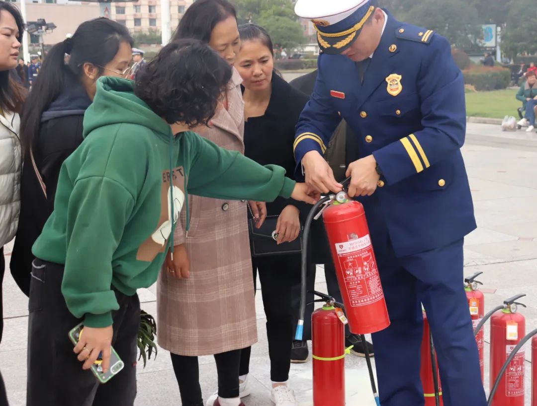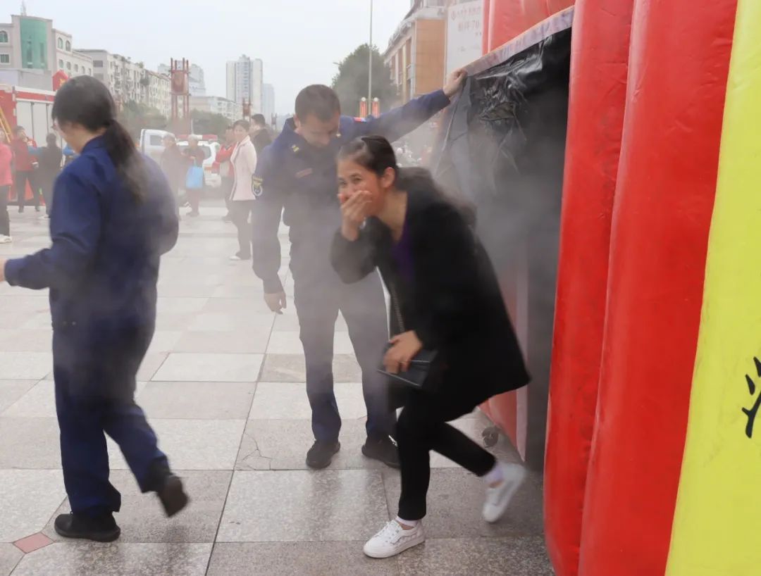 11月8日上午,在大英县政府广场上,消防员正在向群众科普消防知识。前来参与活动的群众兴趣盎然,听取消防员科普、沉浸式体验火灾逃生体验屋、重型防化服穿戴、灭火器扑灭油盆火灾……