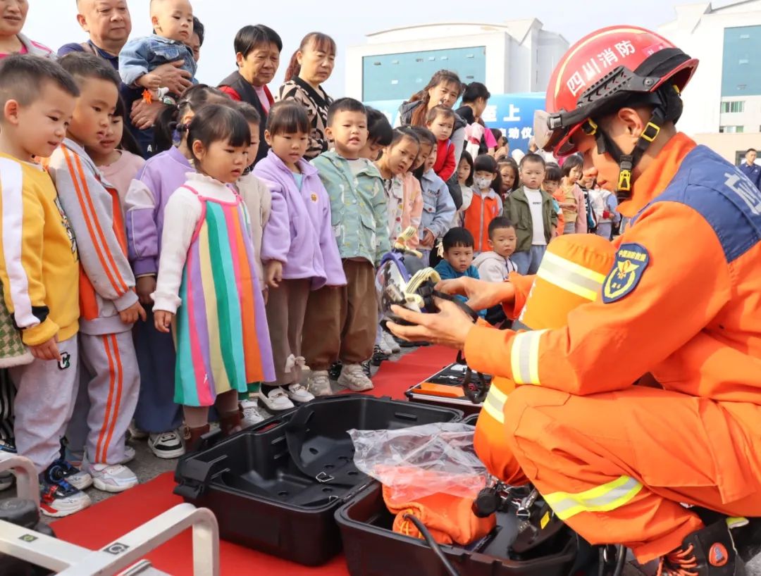 在器材装备展示区,一群小朋友正围着一位消防员听他讲消防知识。过程中,消防员不时向小朋友发问,激发小朋友学习知识的兴趣,小朋友们也争先恐后地回答问题,现场气氛十分热烈。