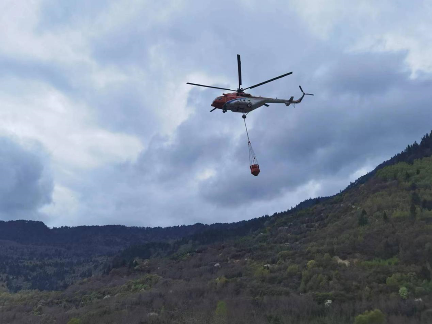 由于两起火灾均发生在高海拔地势陡峭的区域,人员接近火场困难,扑火难度极大。稻城县各卡乡火场多为断崖地形,峭壁林立,平均坡度为70°以上,九寨沟黑河镇火场更是处于悬崖处,人员无法直接到达。同时,当地天干物燥,林下可燃物蓄积量大,火场气象条件复杂,扑救工作困难重重。在分析研判火场态势的基础上,现场科学制定扑救方案,坚持“空地结合、以水灭火”的灭火战术,专业与地方、空中与地面等力量密切协作配合,稳步有序开展处置。扑火队员们不畏艰险,连续奋战,克服山高坡陡、海拔高、风力大、保障难等艰难险阻,在高山峡谷之间,寻找水源、铺设管道、奔袭转移,坚持扑打一段、清理一段、固守一段,稳步向前推进;消防直升机开展空中侦查,与地面协同作业,在悬崖峭壁之上精准悬停吊灭,阻止火势发展蔓延。现场设置安全官、观察哨,确保行动安全有序。